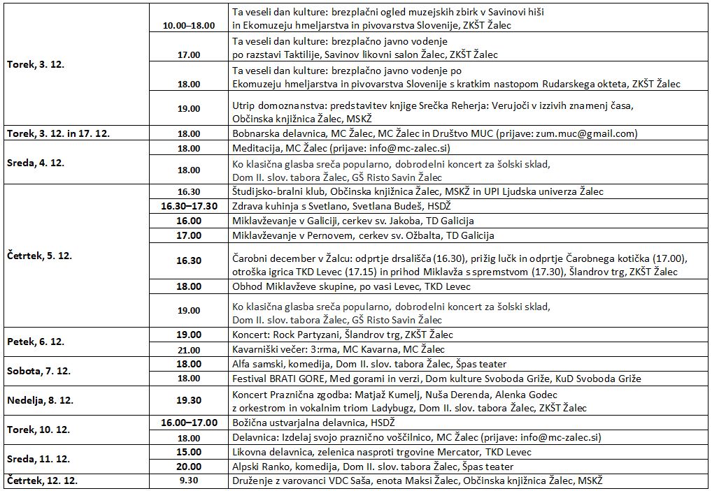 - Čarobni december prinaša odprtje drsališča, prižig lučk, prihod Miklavža in druge zabavne aktivnosti na Šlandrovem trgu. Decembra se bo odvil tudi Božični koncert, številni dobrodelni nastopi in otroške predstave, med drugim Tri peresa in Jesensko-zimska pravljica vile Timber.
